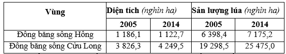 Theo bảng trên, hãy cho biết nhận xét nào sau đây không đúng về diện tích và sản lượng lúa cả năm của Đồng bằng sông Hồng và Đồng bằng sông Cửu Long năm 2005 và năm 2014?