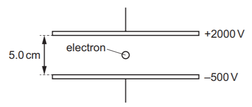 Một electron được giữ lơ lửng đứng yên giữa hai tấm kim loại cách nhau 5 cm. Hai tấm kim loại được duy trì bởi điện thế lần lượt là +2000 V và -500 V. Lực điện tác dụng lên electron là
