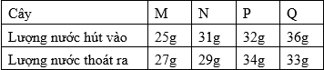 Trong một thí nghiệm, người ta xác định được lượng nước thoát ra và lượng nước hút vào của mỗi cây trong cùng một đơn vị thời gian như sau: