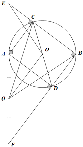 Cho đường tròn \(\left( O \right)\)có \(AB\) là đường kính. Vẽ đường kính \(CD\) không trùng với \(AB.\)Tiếp tuyến tại \(A\) của đường tròn \(\left( O \right)\) cắt các đường thẳng \(BC\) và \(BD\) lần lượt tại \(E\)và \(F.\)Gọi \(Q\) là trung điểm của đoạn thẳng \(AF\)