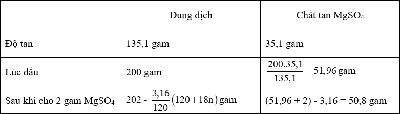 Ở toC khi cho 2 gam MgSO4 vào 200 gam dung dịch MgSO4 bão hòa đã làm cho m gam tinh thể muối MgSO4.nH2O (A) kết tinh. Nung m gam tinh thể A cho đến khi mất nước hoàn toàn thì thu được 3,16 gam MgSO4. Xác định công thức phân tử của tinh thể muối A. Cho biết độ tan của MgSO4 ở toC là 35,1 gam.