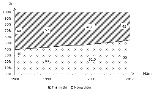 b) Nhận xét sự thay đổi cơ cấu dân số phân theo thành thị và nông thôn của thế giới thời kì 1980 – 2017.