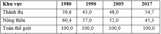Cho bảng số liệu sau:CƠ CẤU DÂN SỐ PHÂN THEO THÀNH THỊ VÀ NÔNG THÔN CỦA THẾ GIỚI THỜI KÌ