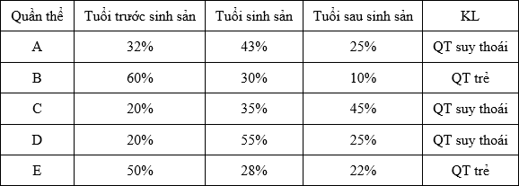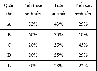 Xét 5 quần thể cùng loài sống ở 5 hồ cá tự nhiên A, B, C, D, E. Tỉ lệ % cá thể của các nhóm tuổi ở mỗi quần thể như sau: