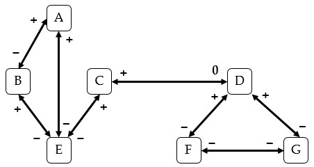 Sơ đồ dưới đây thể hiện mô hình tương tác giữa các quần thể của một hệ sinh thái. Các chữ in hoa kí hiệu cho các quần thể. Mũi tên hai đầu (↔) cho biết có sự tương tác trực tiếp giữa hai quần thể. Các tương tác có thể có lợi (+), có hại (–) hoặc không lợi, không hại (0) đối với mỗi quần thể, được chỉ ra ở cuối các mũi tên. Có bao nhiêu nhận xét sau đây đúng?