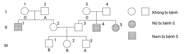 Ở người, bệnh S và hệ nhóm máu do hai cặp gen khác nhau quy định. Trong đó kiểu gen IAIA và IAIO đều quy định nhóm máu A; kiểu gen IBIB và IBIO đều quy định nhóm máu B; kiểu gen IAIB quy định nhóm máu AB; kiểu gen IO quy định nhóm máu O. Biết rằng sự di truyền bệnh S độc lập với di truyền các nhóm máu, quá trình giảm phân bình thường và không có đột biến xảy ra. Khi xét hai tính trạng này trong một gia đình, người ta lập được sơ đồ phả hệ sau:
