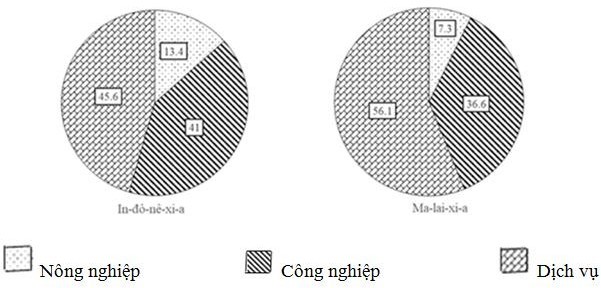 Căn cứ vào biểu đồ, nhận xét nào sau đây đúng về cơ cấu GDP phân theo ngành kinh tế của In-đô-nê-xi-a và Ma-lai-xi-a năm 2018?