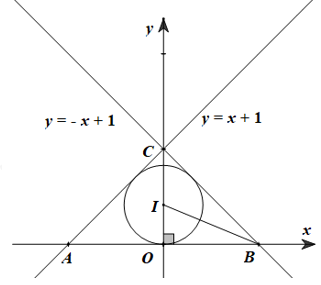 Cho hai đường thẳng \(\left( {{d_1}} \right):y = x + 1,\;\left( {{d_2}} \right):y = - x + 1\). Đường thẳng \(\left( {{d_1}} \right)\) cắt trục hoành tại điểm \(A,\;\left( {{d_2}} \right)\) cắt trục hoành tại điểm \(B.\;\left( {{d_1}} \right),\left( {{d_2}} \right)\) cắt nhau tại điểm C. Bán kính đường tròn nội tiếp tam giác ABC là (kết quả làm tròn đến chữ số thập phân thứ ba)