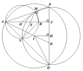 Cho đường tròn \(\left( {O;R} \right)\) đường kính \(AB\). Trên tia \(AB\) lấy điểm \(C\) nằm ngoài đường tròn, kẻ đường thẳng \(d\) vuông góc với \(AB\) tại \(C\). Gọi \(E\)là trung điểm của đoạn thẳng \(OB\), đường thẳng đi qua \(E\) cắt đường tròn \(\left( {O;R} \right)\) ở \(M\) và \(N\) (\(M\) khác \(A\) và \(B\)). Tia \(AM,AN\) thứ tự cắt \(d\) ở \(P\) và \(Q\).