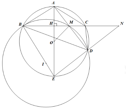 Cho tam giác \(ABC\) cân tại \(A\) \(\left( {\angle BAC > 90^\circ } \right)\) nội tiếp đường tròn \(\left( O \right)\) bán kính \(R,M\) là điểm nằm trên cạnh \(BC\left( {BC > CM} \right).\) Gọi \(D\) là giao điểm \(AM\) và đường tròn \(\left( O \right)\,\,\,\left( {D \ne A} \right),\) điểm \(H\) là trung điểm đoạn thẳng \(BC.\) Gọi \(E\) là điểm chính giữa cung lớn \(BC,ED\) cắt \(BC\) tại \(N.\)