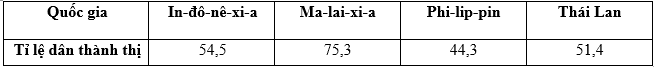 Theo bảng số liệu, nhận xét nào sau đây đúng khi so sánh tỉ lệ dân thành thị của một số quốc gia năm 2017?