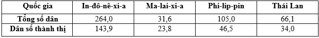 Cho bảng số liệu:DÂN SỐ CỦA MỘT SỐ QUỐC GIA, NĂM 2017(Đơn vị: Triệu người)(Nguồn: Niên