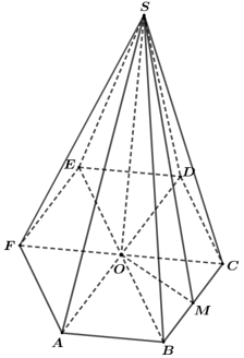 Gọi \(O\) là tâm của lục giác đều \(ABCDEF\), \(SM\) là một trung đoạn của hình chóp.