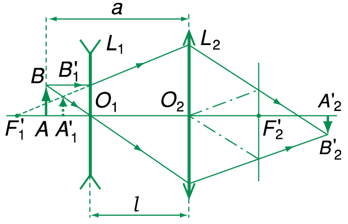 Cho thấu kính hội tụ \({L_2}\) có tiêu cự \({f_2} = 24cm\) và vật AB đặt trên trục chính cách thấu kính một đoạn không đổi \(a = 44cm\). Thấu kính phân kì \({L_1}\) có tiêu cự \({f_1} = - 15cm\) được đặt giữa vật AB và \({L_2}\), cách\({L_2}\) khoảng \(l\) sao cho hai trục chính trùng nhau. Xác định tính chất, vị trí của ảnh sau cùng \({A_2}{B_2}\) trong trường hợp \(l = 34cm\).