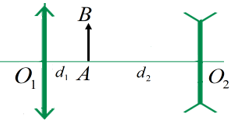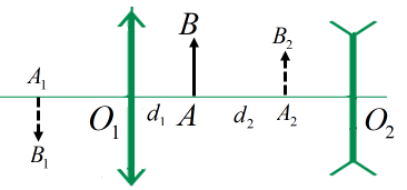 Có hai thấu kính \({L_1},{L_2}\) được đặt đồng trục. Các tiêu cự lần lượt là \({f_1} = 20cm,{\rm{ }}{f_2} = - 20cm\). Vật AB được đặt trên trục chính, vuông góc với trục chính và ở trong khoảng giữa hai quang tâm \({O_1},{O_2}\). Cho \({O_1}{O_2} = l = 50cm\). Xác định vị trí của vật để hai ảnh có độ lớn bằng nhau.