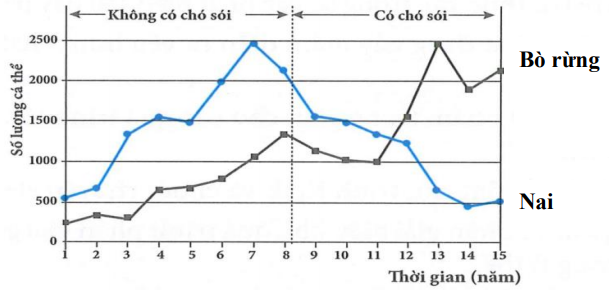 Nai và bò rừng là hai loài ăn cỏ sống trong cùng một khu vực. Hình dưới mô tả những thay đổi về số lượng cá thể trong quần thể của hai loài này trước và sau khi những con chó sói (loài ăn thịt) du nhập vào môi trường sống của chúng.