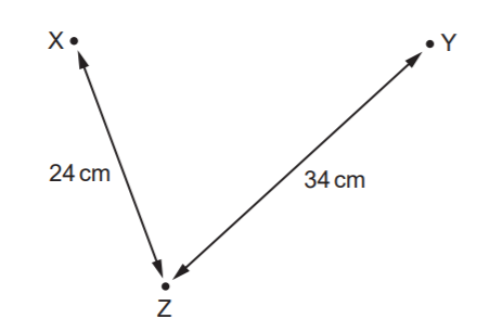 Máy tạo sóng tại hai điểm X và Y trên mặt nước tạo ra sóng có cùng bước sóng. Tại điểm Z, sóng từ X có cùng biên độ với sóng từ Y. Khoảng cách XZ và YZ được cho trên hình vẽ. Khi các máy phát sóng hoạt động cùng pha thì biên độ dao động tại điểm Z bằng không. Bước sóng do máy phát sóng tạo ra có thể là bao nhiêu?