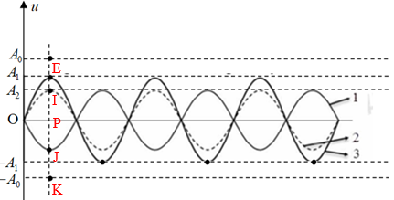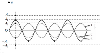 Hình vẽ bên biểu diễn hình dạng của một sợi dây đang có sóng dừng ổn định với biên độ bụng là \({A_0}\), chu kì T. Biết các đường 3, 2, 1 lần lượt là hình dạng sợi dây ở các thời điểm \(t;t + \Delta t;t + 6\Delta t\) và \({A_1} = \sqrt {1,5} {A_2}\). Giá trị nhỏ nhất của \(\Delta t\) là: