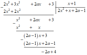 Tìm \(a\) để đa thức \(2{x^3} + 3{x^2} + 2ax + 3\) chia cho đa thức \(\left( {x + 1} \right)\) dư