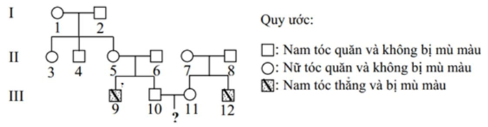 Ở người, gen quy định dạng tóc nằm trên nhiễm sắc thể thường có 2 alen, alen A quy định tóc quăn trội hoàn toàn so với alen a quy định tóc thẳng. Bệnh mù màu đỏ - xanh lục do alen lặn b nằm trên vùng không tương đồng của nhiễm sắc thể giới tính X quy định, alen trội B quy định mắt nhìn màu bình thường. Cho sơ đồ phả hệ sau: