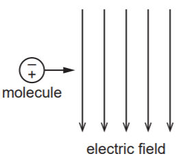 Lưỡng cực điện xảy ra khi các điện tích dương và âm (ví dụ một proton và một điện tử hoặc một cation và một anion) tách rời khỏi nhau và cách nhau một khoảng không đổi. Một phân tử hoạt động như một lưỡng cực điện chuyển động theo phương ngang với vận tốc không đổi vào điện trường đều theo phương thẳng đứng (như hình vẽ). Các điện tích âm và dương của phân tử đi vào điện trường cùng một lúc. Phát biểu nào sau đây là đúng về vận tốc của phân tử trong điện trường?