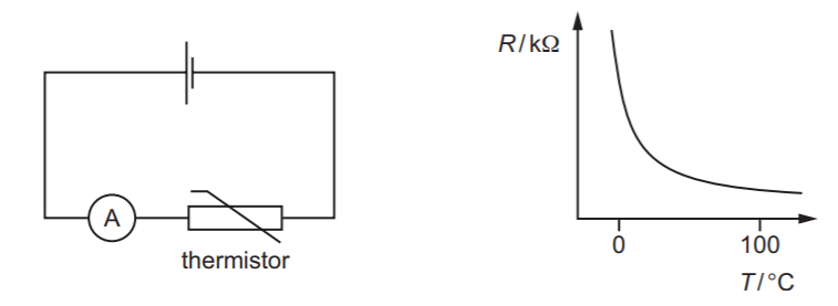 Trong mạch điện, ampe kế đóng vai trò như một nhiệt kế, được mắc nối tiếp với một nhiệt điện trở dưới nguồn điện có suất điện động không đổi (bỏ qua điện trở trong của nguồn điện). Đồ thị biểu diễn sự phụ thuộc điện trở R của nhiệt điện trở vào nhiệt độ T.