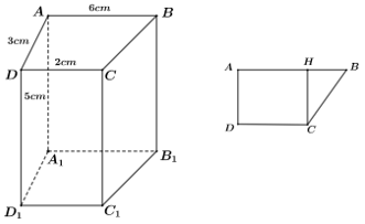 Cho hình lăng trụ đứng \(ABCD.{A_1}{B_1}{C_1}{D_1}\) có đáy \(ABCD\) là hình thang vuông \(\left( {\angle A = \angle D = {{90}^ \circ }} \right)\), \(AB = 6cm\), \(CD = 2cm\), \(AD = 3cm\), \(A{A_1} = 5cm\). Tính diện tích một đáy, diện tích xung quanh, diện tích toàn phần của hình lăng trụ.