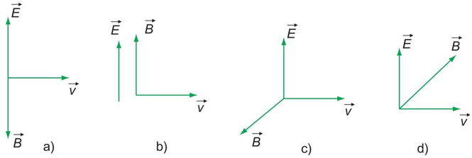 Trong các hình sau, hình nào diễn tả đúng phương và chiều của cường độ điện trường \(\overrightarrow E \), cảm ứng từ \(\overrightarrow B \) và tốc độ truyền sóng \(\overrightarrow v \) của một sóng điện từ?