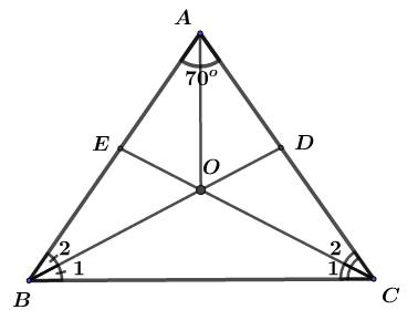 Cho \(\Delta ABC,\,\widehat A = 70^\circ \), hai đường phân giác \(BD\) và \(CE\) cắt nhau tại \(O\), thế thì: