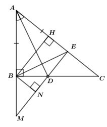 Cho \(\Delta ABC\) có \(\widehat B = 90^\circ \), \(AD\) là tia phân giác của \(\widehat {\rm{A}}\) (\(D \in BC\)). Trên tia \(AC\) lấy điểm E sao cho \(AB\, = \,AE\); kẻ \(BH \bot AC\)\(\left( {H \in AC} \right)\).