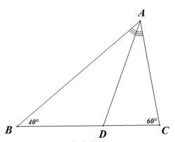 Cho \(\Delta ABC\) có AD là tia phân giác, \(\widehat B = 40^\circ ,\widehat C = 60^\circ \). Khi đó