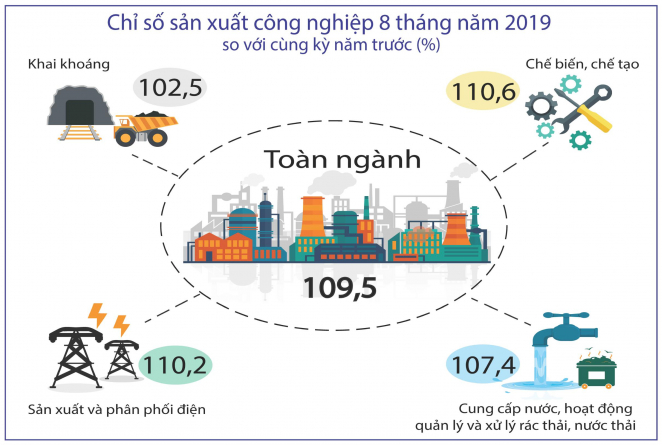 Dựa vào dữ liệu đã cho, hãy cho biết ngành công nghiệp nào có tốc độ tăng trưởng nhanh nhất trong 8 tháng đầu năm 2019?