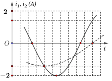 Đặt điện áp \(u = {U_0}\cos \left( {\omega t + \varphi } \right)\,\,({U_0}\) không đổi, ω thay đổi) vào hai đầu đoạn mạch gồm điện trở thuần R, cuộn cảm thuần L và tụ điện C mắc nối tiếp. Khi \(\omega = {\omega _1}\) và \(\omega = {\omega _2}\) thì dòng điện qua đoạn mạch là i1 và i2 có một đoạn đồ thị theo thời gian như hình vẽ. Khi \(\omega = {\omega _1} + {\omega _2}\) thì hệ số công suất của đoạn mạch gần nhất với giá trị nào sau đây?