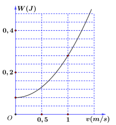Một học sinh làm thí nghiệm với con lắc lò xo treo thẳng đứng có độ cứng k và khối lượng vật nhỏ m không đổi. Học sinh này đưa vật theo phương thẳng đứng đến vị trí lò xo không biến dạng rồi truyền cho vật vận tốc ban đầu \(\overrightarrow {{v_0}} \) hướng xuống thì vật dao động điều hoà và có cơ năng là W. Hình bên biểu diễn sự phụ thuộc của cơ năng W theo vận tốc v0. Bỏ qua lực cản của không khí, lấy g = 10 m/s2 và chọn mốc thế năng tại vị trí cân bằng của vật. Độ cứng k của lò xo là