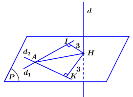 - Gọi \(I,\,\,K\) lần lượt là hình chiếu của \(H\) lên đường thẳng \({d_1},\,\,{d_2}\) , chứng minh \(HI = HK = 3\).