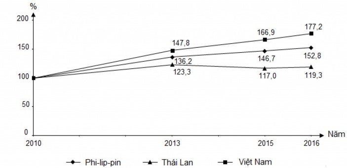 Theo biểu đồ, nhận xét nào sau đây đúng khi so sánh tốc độ tăng trưởng GDP của Phi-lip-pin, Thái Lan và Việt Nam, giai đoạn 2010 – 2016?