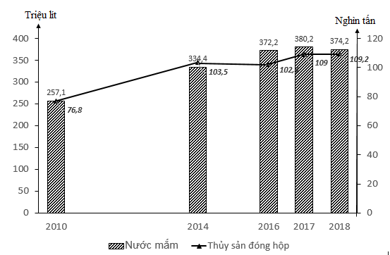 Cho biểu đồ về nước mắm và thủy sản đóng hộp của Việt Nam, giai đoạn 2010 - 2018: (Số