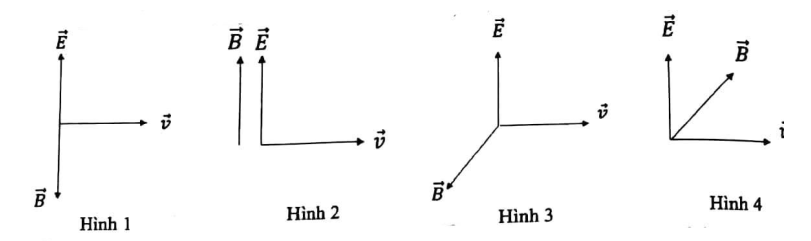 Trong các hình sau đây, hình nào diễn tả đúng phương và chiều của cường độ điện trường \(\overrightarrow E \), cảm ứng từ \(\overrightarrow B \) và vận tốc truyền sóng \(\overrightarrow v \) của một sóng điện từ