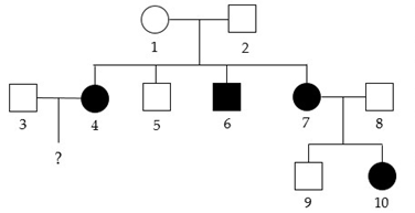 Một quần thể người đang ở trạng thái cân bằng di truyền, tần số người bị mắc một bệnh di truyền do 1 gen quy định là 9%. Phả hệ dưới đây cho thấy một số thành viên (kí hiệu tô màu đen trên phả hệ) bị mắc bệnh này. Kiểu hình của người có đánh dấu (?) là chưa biết.