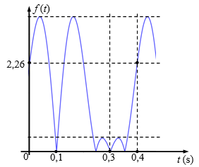 Một con lắc lò xo treo thẳng đứng, dao động điều hòa tại nơi có \(g = 10m/{s^2}\). Lấy \({\pi ^2} = 10\). Hình bên là đồ thị biểu diễn sự phụ thuộc của hàm \(f\left( t \right)\) theo thời gian. (với \(f\left( t \right)\) là độ lớn của tích lực đàn hồi của lò xo tác dụng lên vật với vận tốc của vật). Biết rằng tại thời điểm ban đầu t = 0, vật đang ở vị trí cân bằng. Độ cứng của lò xo gần nhât với giá trị nào sau đây?