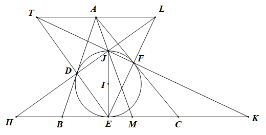 Đường tròn \(\left( I \right)\)nội tiếp tam giác \(ABC\)tiếp xúc với các cạnh \(AB,BC,CA\)lần lượt tại \(D,E,F.\)Kẻ đường kính \(EJ\)của đường tròn \(\left( I \right)\). Gọi \(d\)là đường thẳng qua \(A\)song song với \(BC.\)Đường thẳng \(JD\)cắt \(d,BC\)lần lượt tại \(L,H\).