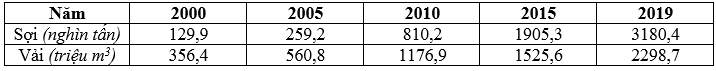 Theo bảng số liệu, để thể hiện tốc độ tăng trưởng sản lượng sợi và vải của nước ta, giai đoạn 2000 - 2019, dạng biểu đồ nào sau đây là thích hợp nhất?