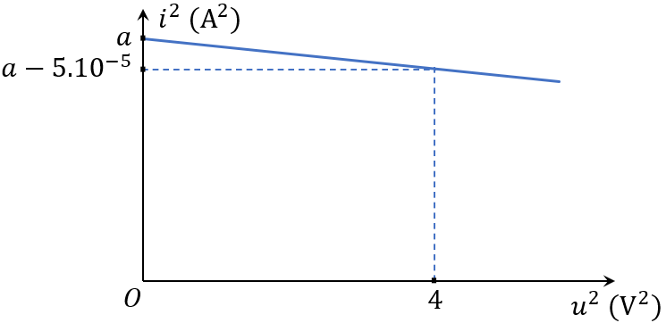 Một mạch dao động LC lí tưởng có \(C = {2.10^{ - 9}}F\) đang dao động điện từ tự do. Cường độ dòng điện tức thời trong mạch và hiệu điện thế tức thời giữa hai bản tụ điện lần lượt là i và u. Sự phụ thuộc của \({i^2}\) vào \({u^2}\) được biểu diễn bằng một đoạn đồ thị như hình vẽ. Giá trị của \(L\) là