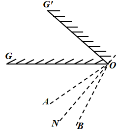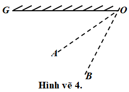 Cho một gương phẳng OG có thể quay quanh một trục đi qua O và vuông góc với mặt phẳng hình vẽ. Một cậu bé đứng ở điểm A và một cô bé đứng ở điểm B trước gương như Hình vẽ 4. Cho biết \(\widehat {AOG} = {30^0},\widehat {BOG} = {50^0}\). Hỏi có thể quay gương cùng chiều kim đồng hồ một góc nhỏ nhất bằng bao nhiêu độ để cậu bé không nhìn thấy ảnh của cô bé trong gương?