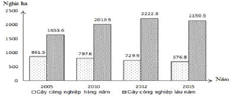 Cho biểu đồ:DIỆN TÍCH CÂY CÔNG NGHIỆP NƯỚC TA GIAI ĐOẠN 2005 - 2015Căn cứ vào biểu đồ, cho
