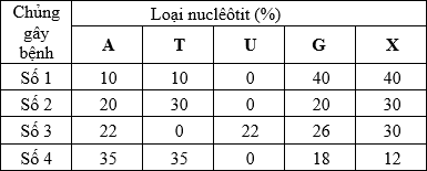 Phân tích vật chất di truyền của 4 chủng vi sinh vật gây bệnh thì thu được kết quả như sau: