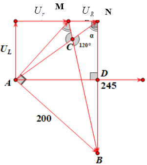 Đặt điện áp xoay chiều \(u = 360\sqrt 2 \cos \left( {100\pi t} \right)\left( V \right)\) vào hai đầu đoạn mạch nối tiếp AB gồm đoạn AM chứa cuộn cảm, đoạn MN chứa điện trở R và đoạn NB chứa tụ điện. Biết điện áp tức thời trên đoạn mạch AM lệch pha \(\frac{\pi }{2}\) so với điện áp tức thời trên đoạn mạch AB; điện áp tức thời trên đoạn mạch AN sớm pha hơn điện áp tức thời trên đoạn mạch MB là \(\frac{{2\pi }}{3}\). Điện áp hiệu dụng trên đoạn mạch NB là 441V và cường độ hiệu dụng qua mạch là 2A, công suất tiêu thụ trên đoạn mạch AB gần nhất với giá trị nào sau đây?