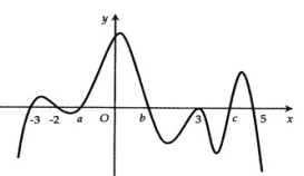 Cho hàm số \(y = f\left( x \right)\) có đạo hàm trên \(\mathbb{R}\) và có đồ thị hàm số \(y = f'\left( x \right)\) cắt trục hoành tại các điểm có hoành độ \( - 3,\,\, - 2,\,\,a,\,b,\,\,3,\,\,c,\,\,5\) với \( - \dfrac{4}{3} < a < - 1,\,\,1 < b < \dfrac{4}{3}\), \(4 < c < 5\) (có dạng như hình vẽ bên dưới). Có bao nhiêu giá trị nguyên của tham số thực \(m\) để hàm số \(y = f\left( {2\left| x \right| + m - 3} \right)\) có 7 điểm cực trị?