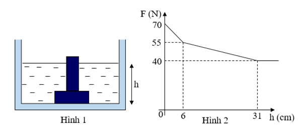 2. Có hai viên gạch đặc, không ngấm nước, có dạng hình hộp chữ nhật giống nhau, đặt chồng lên nhau rồi đặt trên đáy một bể cá như Hình 1. Ban đầu bể không có nước, sau đó người ta đổ từ từ nước vào bể và ghi lại sự phụ thuộc của áp lực F do các viên gạch tác dụng lên đáy bể vào độ cao h của lớp nước trong bể, được đồ thị như Hình 2. Xác định các kích thước của viên gạch và khối lượng riêng của vật liệu làm gạch. Cho khối lượng riêng của nước là \({D_n} = 1000\,\,kg/{m^3}\).