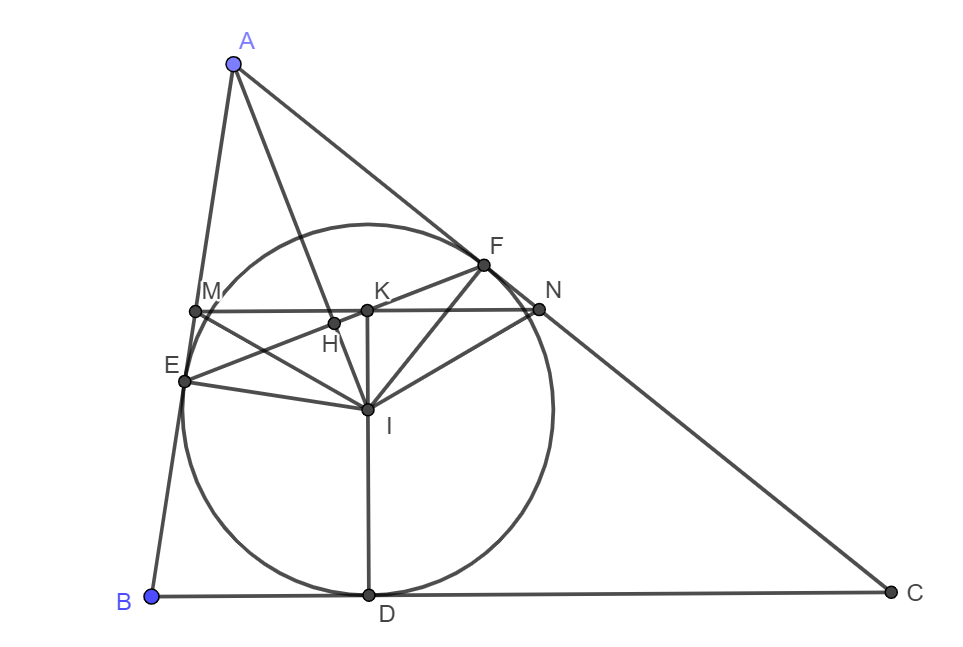 Cho tam giác \(ABC\) có \(\angle A = 60^\circ \). Đường tròn tâm \(I\) bán kính \(r\) nội tiếp tam giác \(ABC\) tiếp xúc với các cạnh \(BC,AB,AC\) lần lượt tại \(D,E,F\). Đường thẳng \(ID\) cắt \(EF\) tại \(K\), đường thẳng qua \(K\) song song với \(BC\) cắt \(AB,AC\) theo thứ tự tại \(M,N\).